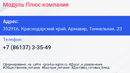 Модуль Плюс, компания по адресу 352916, Краснодарский край, Армавир, Тоннельная, 23 в дальнейшем Организация, размещена в следующих категориях: