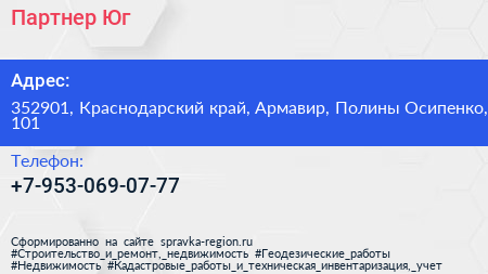 Партнер-Юг по адресу 352901, Краснодарский край, Армавир, Полины Осипенко, 101 в дальнейшем Организация, размещена в следующих категориях: