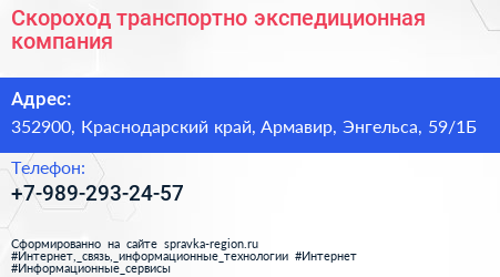 Скороход, транспортно-экспедиционная компания по адресу 352900, Краснодарский край, Армавир, Энгельса, 59/1Б в дальнейшем Организация, размещена в следующих категориях: