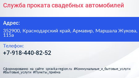 Служба проката свадебных автомобилей по адресу 352900, Краснодарский край, Армавир, Маршала Жукова, 115а в дальнейшем Организация, размещена в следующих категориях: