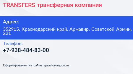 TRANSFERS, трансферная компания по адресу 352915, Краснодарский край, Армавир, Советской Армии, 221 в дальнейшем Организация, размещена в следующих категориях: