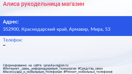 Алиса-рукодельница, магазин по адресу 352900, Краснодарский край, Армавир, Мира, 53 в дальнейшем Организация, размещена в следующих категориях: