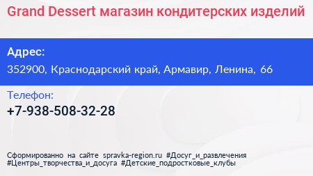 Grand Dessert, магазин кондитерских изделий по адресу 352900, Краснодарский край, Армавир, Ленина, 66 в дальнейшем Организация, размещена в следующих категориях: