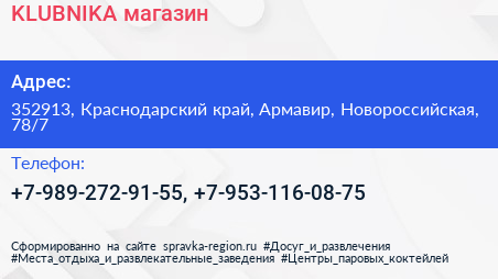 KLUBNIKA, магазин по адресу 352913, Краснодарский край, Армавир, Новороссийская, 78/7 в дальнейшем Организация, размещена в следующих категориях: