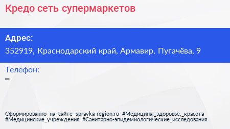 Кредо, сеть супермаркетов по адресу 352919, Краснодарский край, Армавир, Пугачёва, 9 в дальнейшем Организация, размещена в следующих категориях: