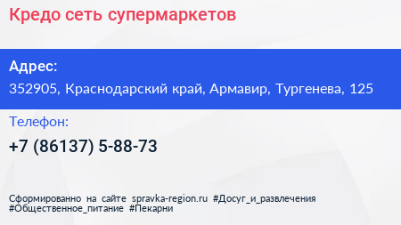 Кредо, сеть супермаркетов по адресу 352905, Краснодарский край, Армавир, Тургенева, 125 в дальнейшем Организация, размещена в следующих категориях: