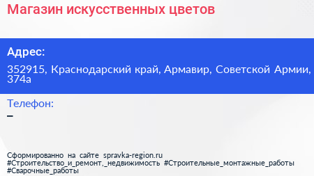 Магазин искусственных цветов по адресу 352915, Краснодарский край, Армавир, Советской Армии, 374а в дальнейшем Организация, размещена в следующих категориях: