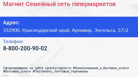 Магнит Семейный, сеть гипермаркетов по адресу 352900, Краснодарский край, Армавир, Энгельса, 57/2 в дальнейшем Организация, размещена в следующих категориях: