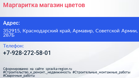 Маргаритка, магазин цветов по адресу 352915, Краснодарский край, Армавир, Советской Армии, 287Б в дальнейшем Организация, размещена в следующих категориях: