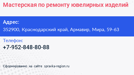 Мастерская по ремонту ювелирных изделий по адресу 352900, Краснодарский край, Армавир, Мира, 59-63 в дальнейшем Организация, размещена в следующих категориях: