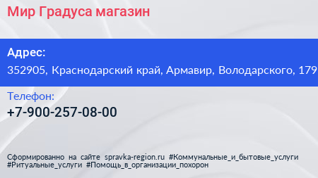 Мир Градуса, магазин по адресу 352905, Краснодарский край, Армавир, Володарского, 179 в дальнейшем Организация, размещена в следующих категориях: