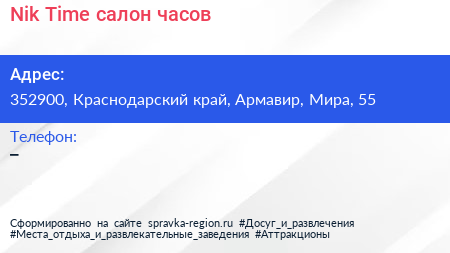 Nik Time, салон часов по адресу 352900, Краснодарский край, Армавир, Мира, 55 в дальнейшем Организация, размещена в следующих категориях: