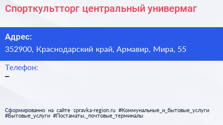 Спорткультторг, центральный универмаг по адресу 352900, Краснодарский край, Армавир, Мира, 55 в дальнейшем Организация, размещена в следующих категориях: