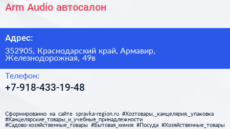 Arm-Audio, автосалон по адресу 352905, Краснодарский край, Армавир, Железнодорожная, 49в в дальнейшем Организация, размещена в следующих категориях: