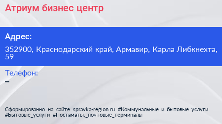 Атриум, бизнес-центр по адресу 352900, Краснодарский край, Армавир, Карла Либкнехта, 59 в дальнейшем Организация, размещена в следующих категориях:
