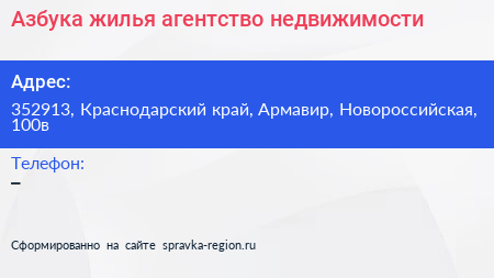 Азбука жилья, агентство недвижимости по адресу 352913, Краснодарский край, Армавир, Новороссийская, 100в в дальнейшем Организация, размещена в следующих категориях: