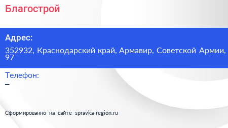 Благострой по адресу 352932, Краснодарский край, Армавир, Советской Армии, 97 в дальнейшем Организация, размещена в следующих категориях: