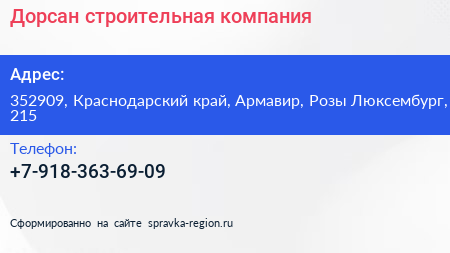 Дорсан, строительная компания по адресу 352909, Краснодарский край, Армавир, Розы Люксембург, 215 в дальнейшем Организация, размещена в следующих категориях: