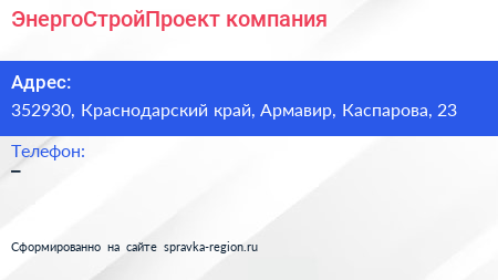 ЭнергоСтройПроект, компания по адресу 352930, Краснодарский край, Армавир, Каспарова, 23 в дальнейшем Организация, размещена в следующих категориях: