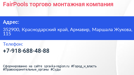 FairPools, торгово-монтажная компания по адресу 352900, Краснодарский край, Армавир, Маршала Жукова, 115 в дальнейшем Организация, размещена в следующих категориях: