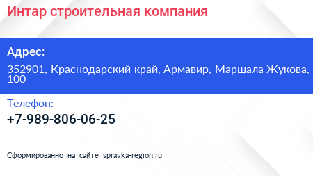 Интар, строительная компания по адресу 352901, Краснодарский край, Армавир, Маршала Жукова, 100 в дальнейшем Организация, размещена в следующих категориях: