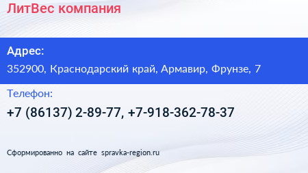 ЛитВес, компания по адресу 352900, Краснодарский край, Армавир, Фрунзе, 7 в дальнейшем Организация, размещена в следующих категориях:
