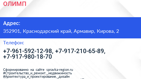 ОЛИМП по адресу 352901, Краснодарский край, Армавир, Кирова, 2 в дальнейшем Организация, размещена в следующих категориях:
