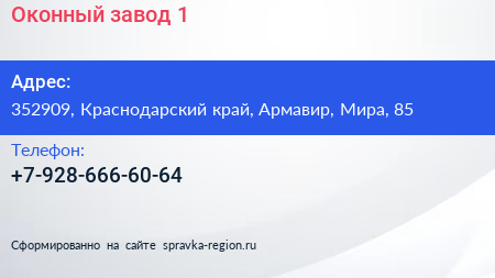 Оконный завод №1 по адресу 352909, Краснодарский край, Армавир, Мира, 85 в дальнейшем Организация, размещена в следующих категориях: