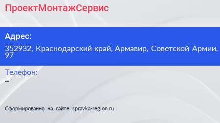 ПроектМонтажСервис по адресу 352932, Краснодарский край, Армавир, Советской Армии, 97 в дальнейшем Организация, размещена в следующих категориях: