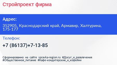 Стройпроект, фирма по адресу 352905, Краснодарский край, Армавир, Халтурина, 175-177 в дальнейшем Организация, размещена в следующих категориях: