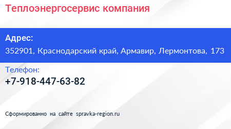 Теплоэнергосервис, компания по адресу 352901, Краснодарский край, Армавир, Лермонтова, 173 в дальнейшем Организация, размещена в следующих категориях: