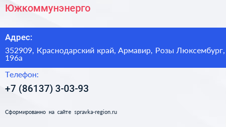 Южкоммунэнерго по адресу 352909, Краснодарский край, Армавир, Розы Люксембург, 196а в дальнейшем Организация, размещена в следующих категориях: