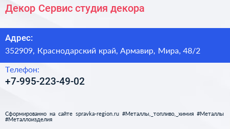 Декор-Сервис, студия декора по адресу 352909, Краснодарский край, Армавир, Мира, 48/2 в дальнейшем Организация, размещена в следующих категориях: