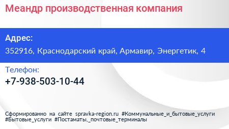 Меандр, производственная компания по адресу 352916, Краснодарский край, Армавир, Энергетик, 4 в дальнейшем Организация, размещена в следующих категориях: