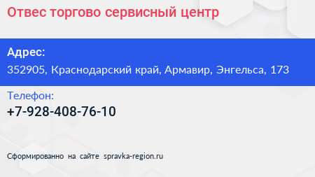 Отвес, торгово-сервисный центр по адресу 352905, Краснодарский край, Армавир, Энгельса, 173 в дальнейшем Организация, размещена в следующих категориях: