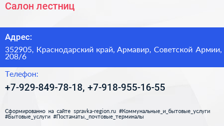 Салон лестниц по адресу 352905, Краснодарский край, Армавир, Советской Армии, 208/6 в дальнейшем Организация, размещена в следующих категориях: