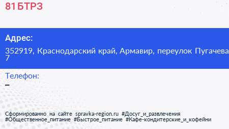 81 БТРЗ по адресу 352919, Краснодарский край, Армавир, переулок Пугачева, 7 в дальнейшем Организация, размещена в следующих категориях: