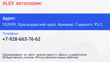 ALEX, автосервис по адресу 352909, Краснодарский край, Армавир, Горького, 95/1 в дальнейшем Организация, размещена в следующих категориях: