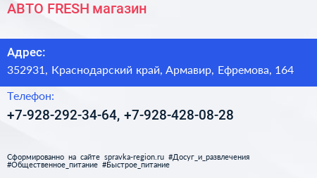 AВТО FRESH, магазин по адресу 352931, Краснодарский край, Армавир, Ефремова, 164 в дальнейшем Организация, размещена в следующих категориях: