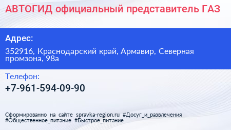 АВТОГИД, официальный представитель ГАЗ по адресу 352916, Краснодарский край, Армавир, Северная промзона, 98а в дальнейшем Организация, размещена в следующих категориях: