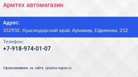 Армтех, автомагазин по адресу 352932, Краснодарский край, Армавир, Ефремова, 252 в дальнейшем Организация, размещена в следующих категориях: