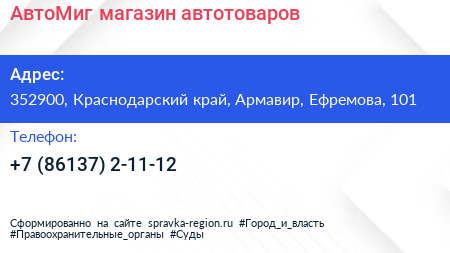 АвтоМиг, магазин автотоваров по адресу 352900, Краснодарский край, Армавир, Ефремова, 101 в дальнейшем Организация, размещена в следующих категориях: