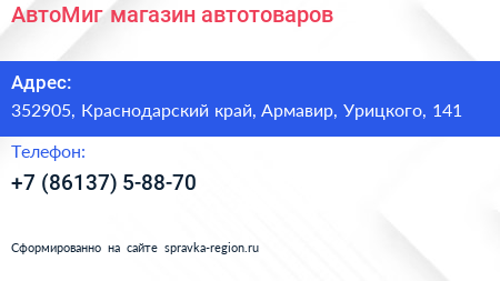 АвтоМиг, магазин автотоваров по адресу 352905, Краснодарский край, Армавир, Урицкого, 141 в дальнейшем Организация, размещена в следующих категориях:
