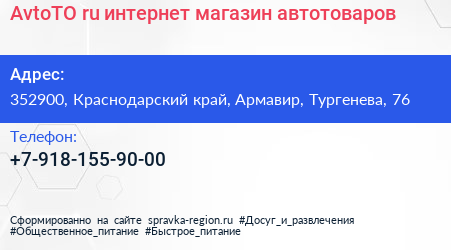 AvtoTO.ru, интернет-магазин автотоваров по адресу 352900, Краснодарский край, Армавир, Тургенева, 76 в дальнейшем Организация, размещена в следующих категориях: