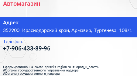Автомагазин по адресу 352900, Краснодарский край, Армавир, Тургенева, 108/1 в дальнейшем Организация, размещена в следующих категориях: