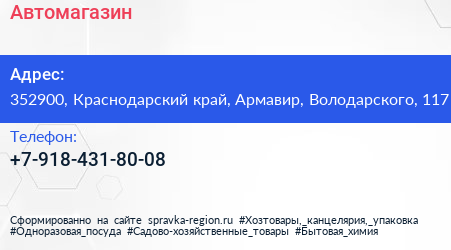 Автомагазин по адресу 352900, Краснодарский край, Армавир, Володарского, 117 в дальнейшем Организация, размещена в следующих категориях: