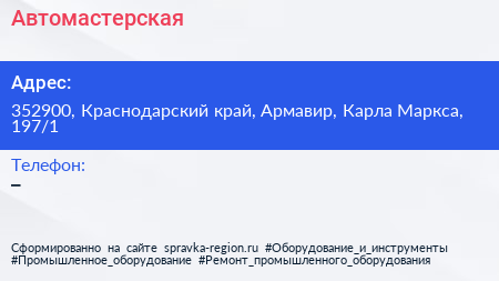 Автомастерская по адресу 352900, Краснодарский край, Армавир, Карла Маркса, 197/1 в дальнейшем Организация, размещена в следующих категориях: