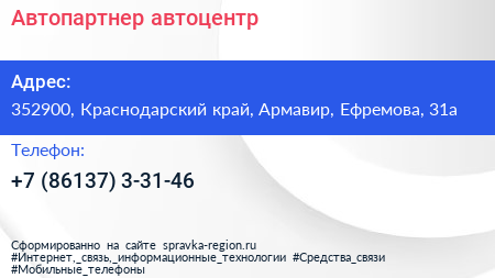Автопартнер, автоцентр по адресу 352900, Краснодарский край, Армавир, Ефремова, 31а в дальнейшем Организация, размещена в следующих категориях: