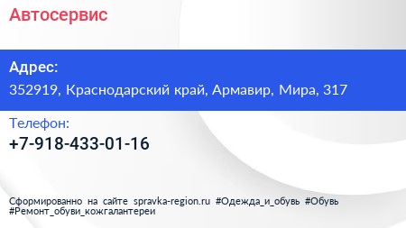 Автосервис по адресу 352919, Краснодарский край, Армавир, Мира, 317 в дальнейшем Организация, размещена в следующих категориях: