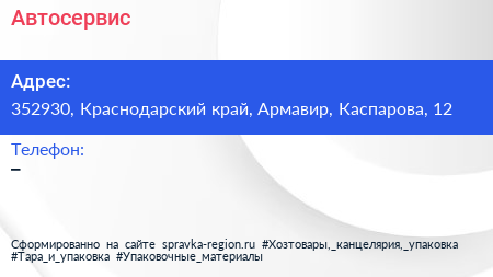 Автосервис по адресу 352930, Краснодарский край, Армавир, Каспарова, 12 в дальнейшем Организация, размещена в следующих категориях: